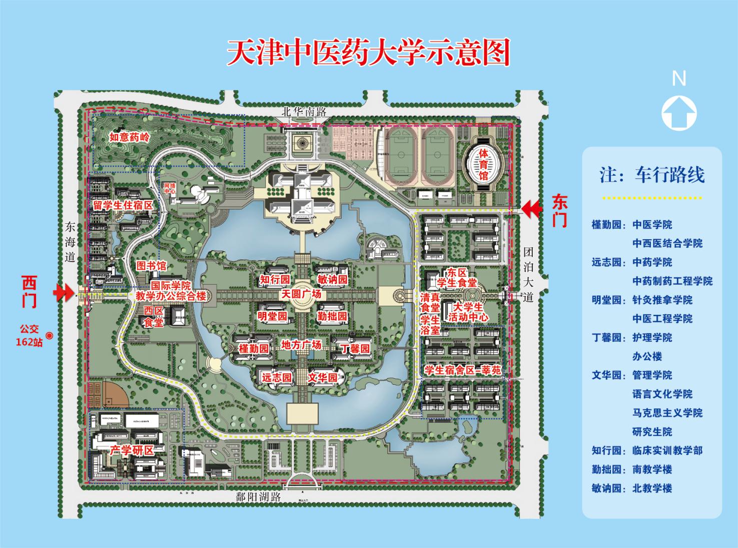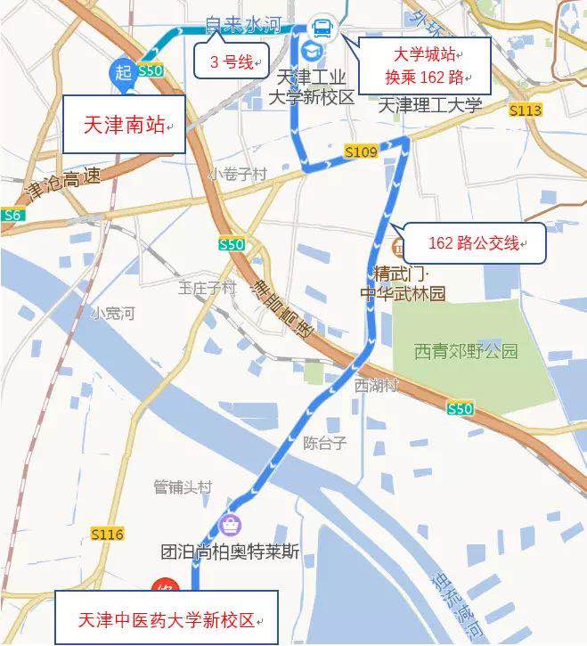 提示:乘坐162至新校区,请在天津体育学院新校区站下车,对面即是我校西门