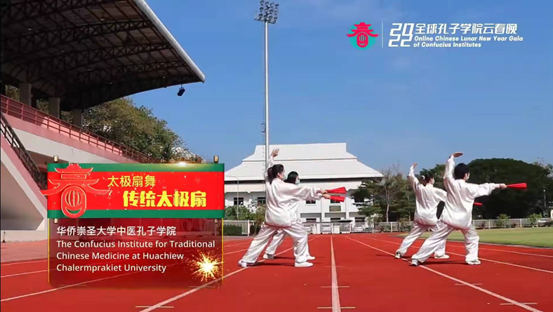 为了参加全球孔院云春晚,我校泰国中医孔院拿出看家绝活——“太极功夫扇”表演。太极扇作为风格独特的武术健身项目,融合了太极拳和其他武术、舞蹈动作,充满飘逸的美感与武术的阳刚威仪,彰显中医太极文化,兼具观赏性与艺术性,展示了丰富的文化内涵。