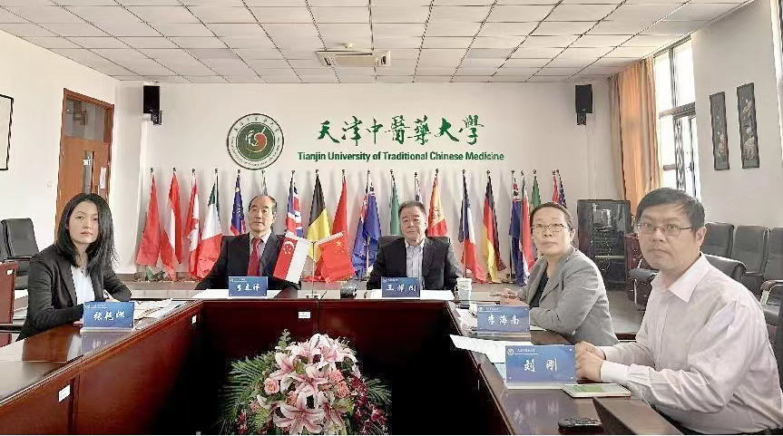 2023年3月9日,在天津市人民政府外事办公室的组织协调下,天津中医药大学与新加坡中医学院校领导及相关教师一起就两校开展中医药教育交流与合作事宜举行了视频交流会。天津市人民对外友好协会秘书长董英明、我校副校长王耀刚、新加坡中医学院副院长陈坤耀分别就进一步加强两校合作发言,并同与会人员就下一步合作计划进行了交流与探讨。