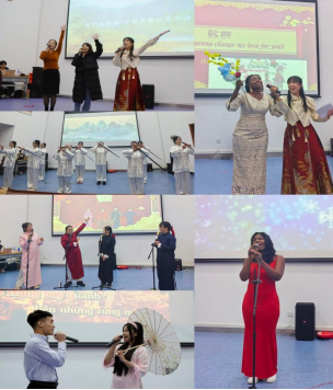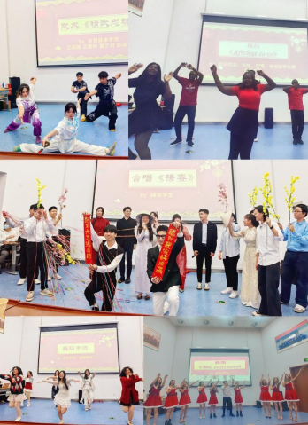 活动分为“秀‘外’汇‘中’”、“文化和谐”、“启航2025”三个篇章。第一篇章在马来西亚同学别具风格的舞蹈和体院同学的传统武术《精武忠魂》中拉开序幕,看着中国学生那动若飞龙、精神抖擞的飒爽英姿,来自“一带一路”国家的留学生也换上太极服、展示了体育课堂所学—太极剑,诠释了舒展优雅、整齐划一的太极神韵。越南同学们则用一首越南传统民歌—《接春》迎接新年,不仅表达了对传统文化的传承和弘扬,更表达了对春节申遗成功的喜悦和祝福。《“中”式翻译》留学生原创群口相声给在场的师生们留下了深刻的印象,来自马来西亚和缅甸的同学以中外语言学习为创作蓝本,以幽默诙谐和夸张的语言完美诠释,她们四袭长衫台风稳、范儿正、笑料足,将本场演出的气氛推向了高潮。各类节目刚柔相济、和合共生,充分展现了不同国家和民族的文化和谐与交融。曾获天中好声音冠军的我院加蓬留学生玛丽的深情演唱、身着传统服饰的越南交际舞展示、与文传学院学生联袂演出的《歌舞串烧》和葫芦丝演奏以及师生唱响《中国话》,将晚会一次次推向高潮,惊喜不断。最终第三篇章的“启航2025”在蒙古学生热情奔放的传统舞曲以及非洲学生炽热强烈的非洲草裙舞中落下帷幕。