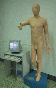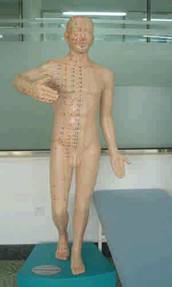 现代针灸铜人——经穴学学习系统为与真人等大的人体经络腧穴模型,模型右侧有经络循行线和400个国家标准穴位。学生可在此模型上自主练习穴位定位,教师可以进行穴位考核,排除以往在人体上同学之间相互点穴训练和考核的主观性,有利于解决点穴考试的主观性等问题。